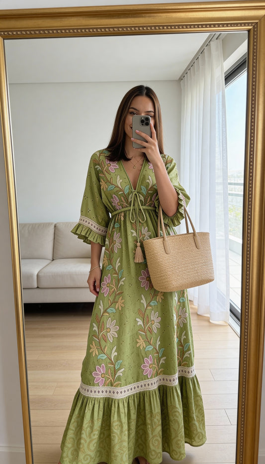 Vestido Aylla Floral Verde Bordado